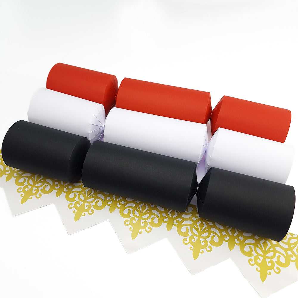 Supplied as a kit to make twelve crackers, containing pre-cut premium quality cracker boards, cracker snappy strips, jokes, our exclusive adjustable paper hats and a link to our online inspiration for assembly.