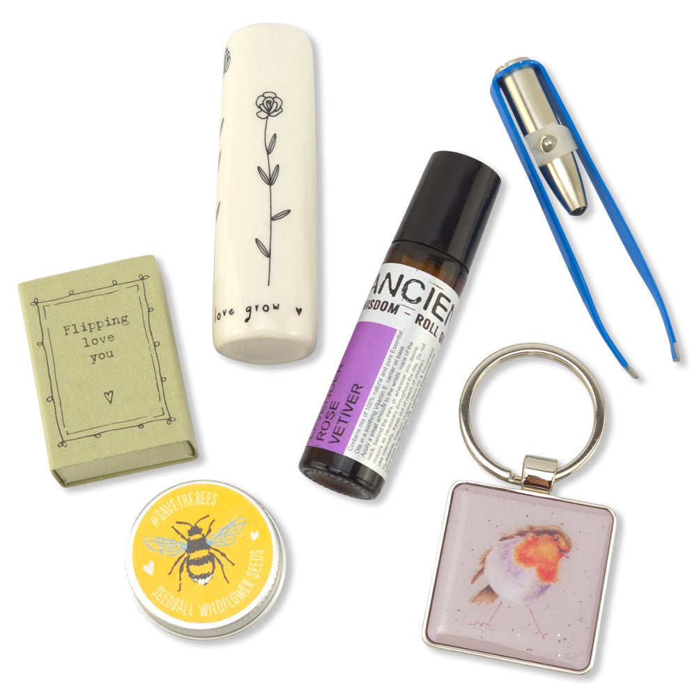The selection includes a "Flipping Love You" mini ceramic penguin in a little matchbox, metal tweezers with an LED light, "Let Love Grow" mini 8cm tall ceramic bud vase, a gorgeous Wrendale robin design metal keyring, "Just Chill" 10ml aromatherapy roll on oil and a "Save the Bees" mini tin of five bee friendly seedballs.