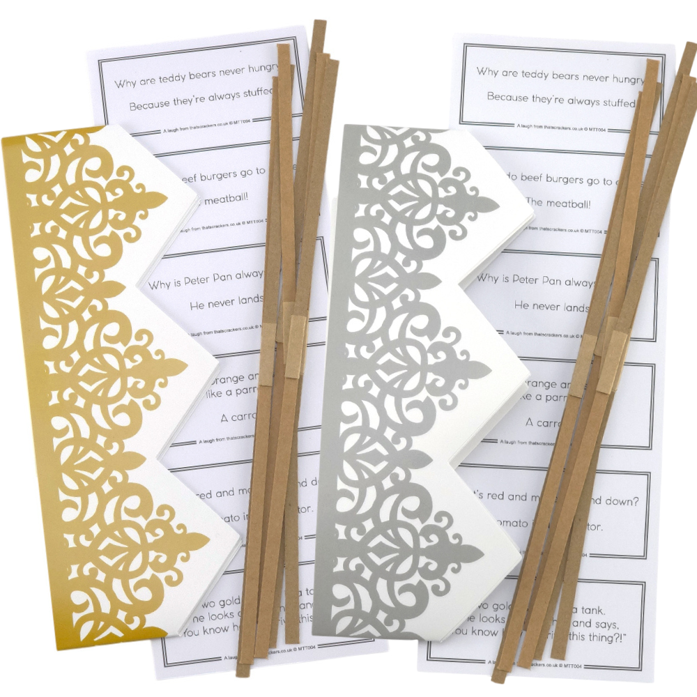 Each accessory pack theme is available with a choice of either gold or silver printed cracker hats.
