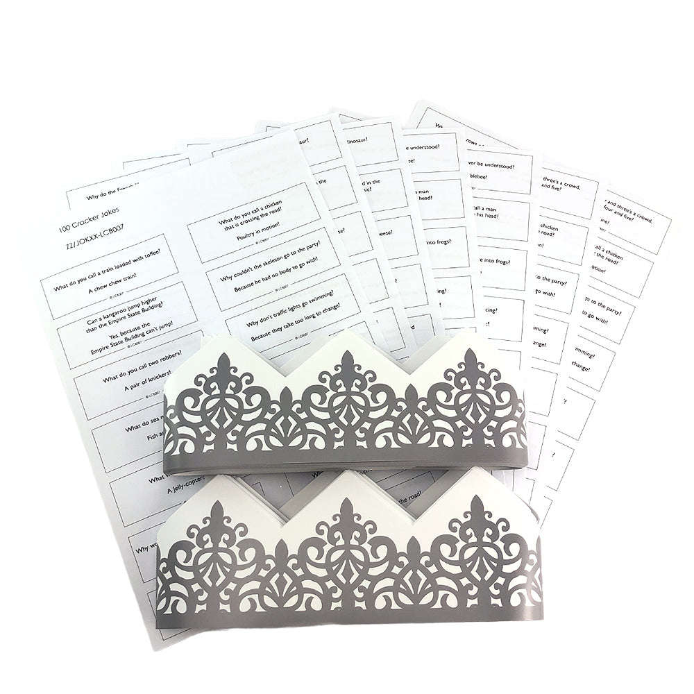 100 assorted jokes and 100 adjustable paper hats for DIY cracker making.