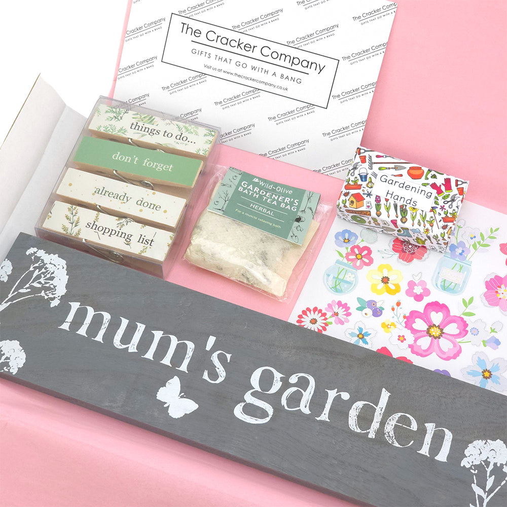 If so, this garden themed collection contains a wooden 'Mum's Garden' sign, a set of flower stickers, 4 garden themed "to do list" wooden pegs, a 'Gardening Hands' spearmint soap and a relaxing herbal bath tea bag.