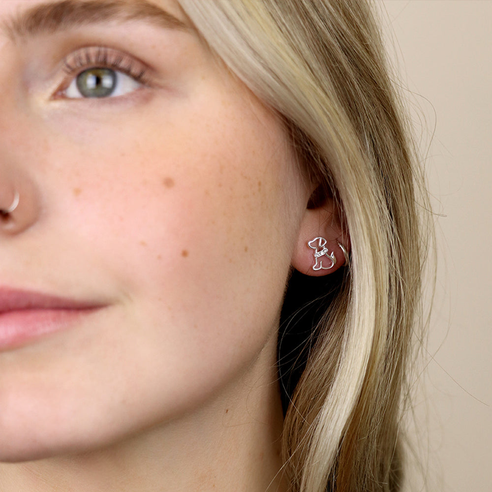 Sterling silver stud earrings with outlines of cute puppies complete with CZ crystal collars, presented in a pretty gift box.