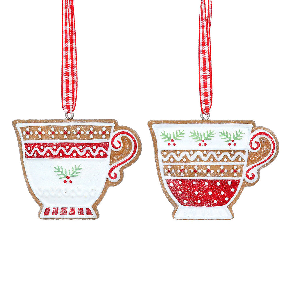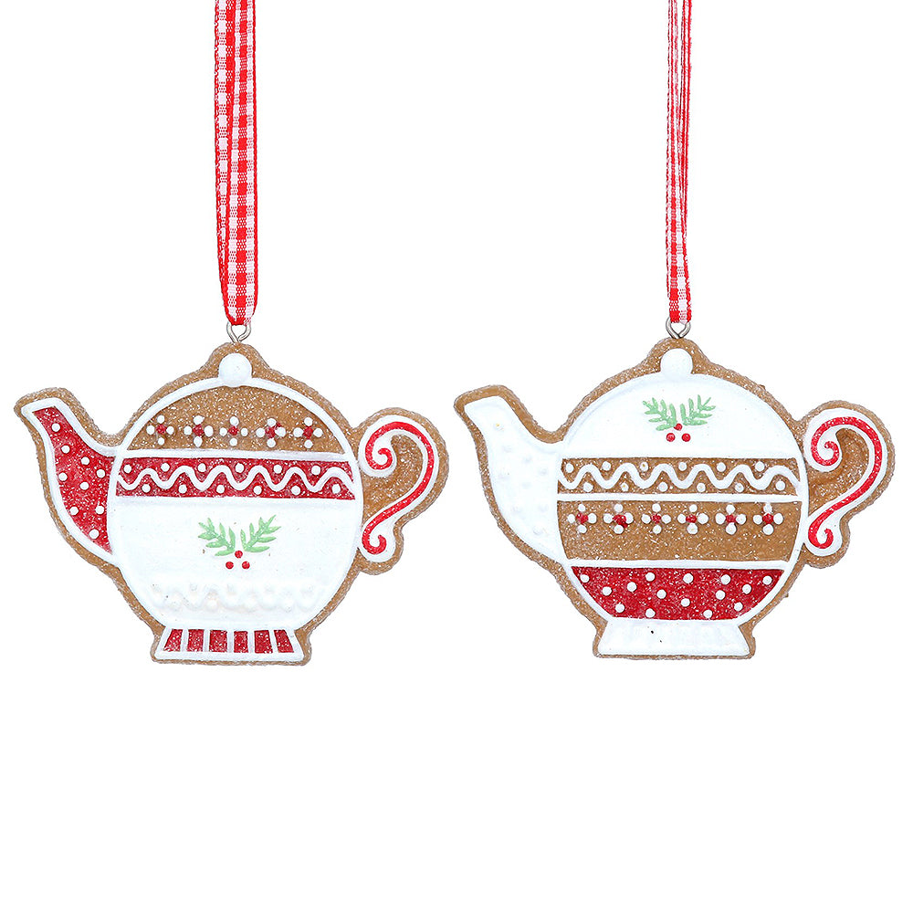 The gingerbread person ornaments are 6cm tall and you will receive two different designs. The teapot ornament is 5.5cm tall and the teacup is 5cm tall. All four of the ornaments are decorated on one side and plain brown on the other, like a real gingerbread cookie!