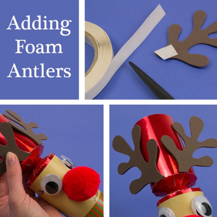 Push the foam antlers out of their foam surround. Use a small piece of double sided tape on the bottom of each antler to stick them to the cracker.