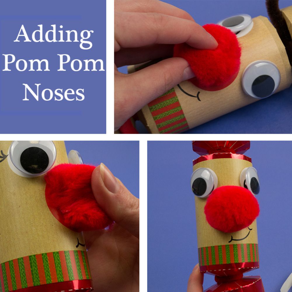 For the pom pom nose, add some tape to the reindeer face and push the pom pom onto this.