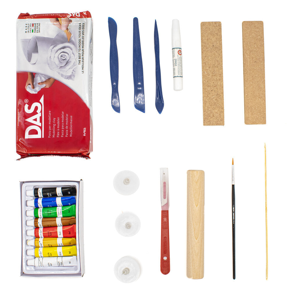 The kit includes 1kg air dry clay, three modelling tools, glue, rolling pin and guides, acrylic paint set, three LED lights, craft knife, paintbrush and wooden skewer, together with instructions.